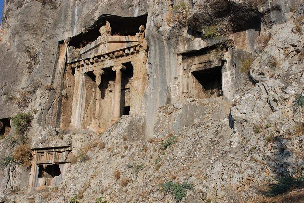 2. Can you go inside the Tomb of Amyntas? Answer: Yes, you can climb up to the entrance of the main tomb, Amyntas, and see the carved burial chamber. However, the chamber itself is empty today. The other smaller tombs are not accessible for climbing.
