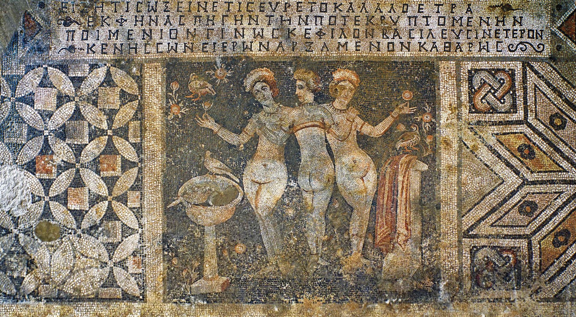 At the center of the mosaic, the three daughters of Zeus, the chief god of Greek mythology, are depicted: Aglaia (Splendor), Thalia (Good Cheer), and Euphrosine (Mirth). These muses of art and beauty are known as the "Three Graces," or "Kharites" in mythology. This work of art, created from tiny black, white, and yellow stones, is surrounded by bird and flower motifs native to the region. The most poignant part of the mosaic is the Greek inscription on it. Poimenios speaks to us from 1600 years away: