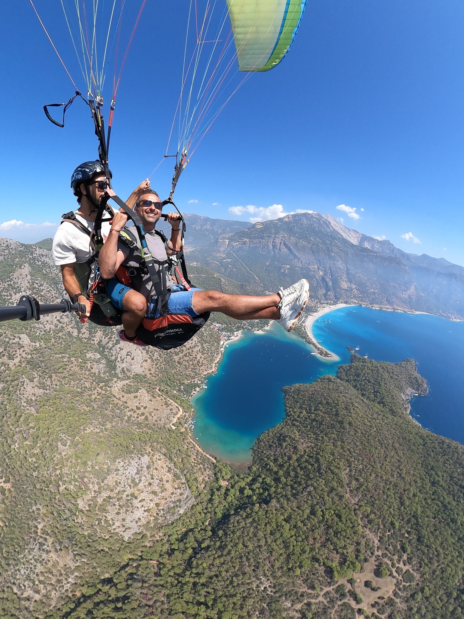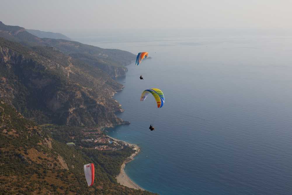 This is the moment! All earthly sounds are left below, replaced only by the sweet hum of the wind. Beneath your feet lies one of the most photographed landscapes in the world: the famous lagoon of Ölüdeniz (Blue Lagoon), shimmering like a palette with dozens of shades of turquoise and blue. This sky journey, lasting approximately 25 to 40 minutes, is so special it will make you forget all the other views you've ever seen.