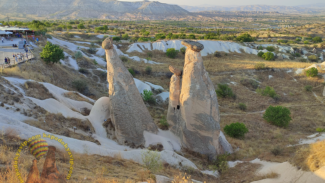 The most distinct feature that sets these three fairy chimneys apart is the rock blocks on their tops, known as caps. This natural wonder, formed over millions of years by wind and floodwaters eroding the tuffaceous land, consists of two large and one small fairy chimney, resembling a family. That's why this place is not just a geological formation but also Cappadocia's window to the world, a cultural symbol.