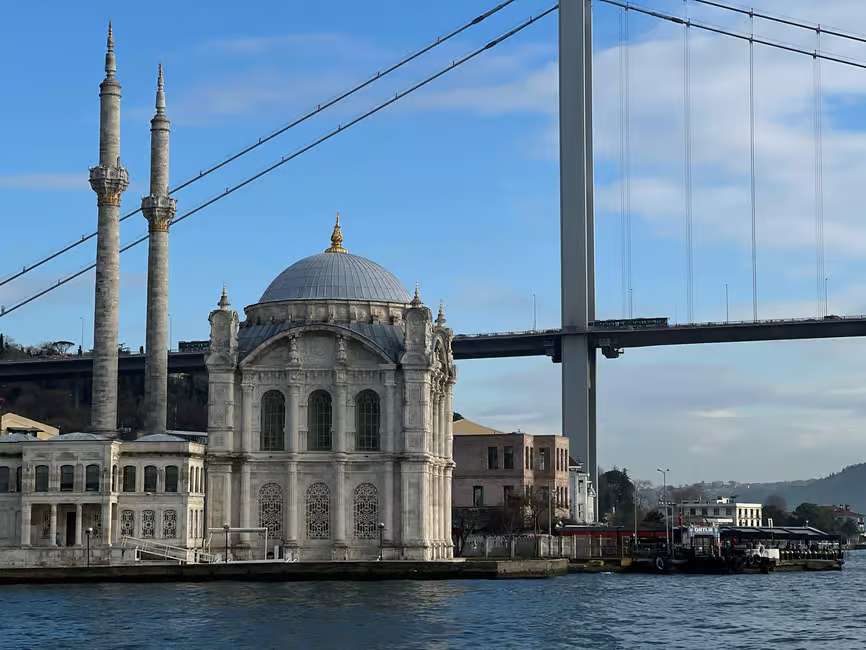 First, we'll pass the European side, seeing landmarks like the majestic Galata Tower, the opulent Dolmabahçe Palace, the splendid Çırağan Palace, and the stunning Ortaköy Mosque with its impressive columns. You'll also marvel at the suspension engineering of the Bosphorus Bridge.