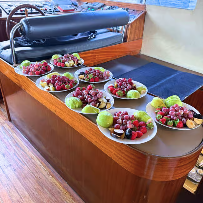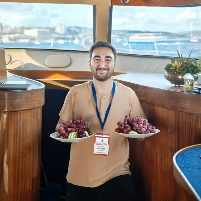 On our yacht, you will not only enjoy the stunning views of Istanbul, but we also have a treat for you. As you admire the beauty of the Bosphorus, our attentive staff will serve you light snacks and seasonal fruits.
