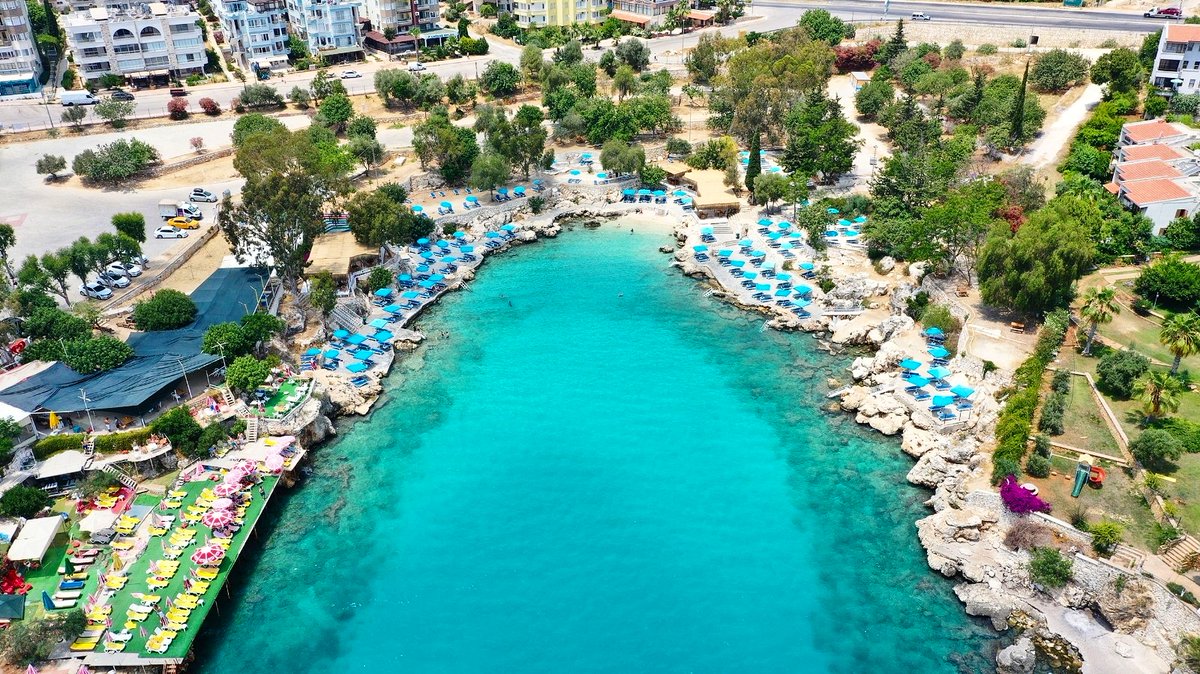 iki sezlong bir semsiye 150 TL verdigimiz bir halk plaji. 3 katli yarim daire bir yapi dusunun, en alt katta koy var. Merdivenler gecisler icin kullaniliyor.Deniz giriste biraz taslik ama kötû degil. Sagda solda bir kac merdivenden de denize girilebiliyor.Cocuklarin oynayabilegi bir sahili yok. Deniz cok temiz ve su ara ara soguksu akintisi oldugu icin cok gûzel. Yemek olarak sikma ve fast food secenekleri var. Dus sayisi yeterli ancak soyunma kabini ve wc sayisi yetersiz. Sezlonglarda oturup akdeniz manzarasi keyifle izlenebilecek bir yer. Sezonda cok kalabalik oldugundan erken saatlerde gitmek istediginiz yerde sezlong bulma sansi verecektir.